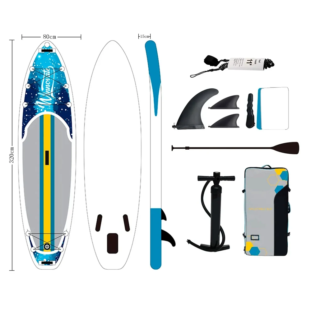 В носовой части расположилась удобная карго-система, позволяющая взять с собой в путешествие все необходимые вещи. Точность курса и простоту управления обеспечивают три прочных плавника, расположенных в кормовой части SUP-борда, а благодаря своим габаритам 320*82*15см сап остается устойчивым даже при волнении.