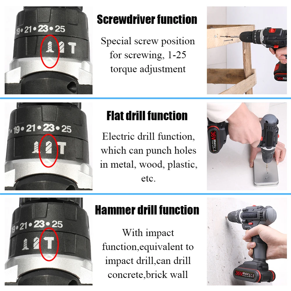 Эта электрическая дрель оснащена аккумулятором высокой мощности, не ограничена проводами, аккумулятор легко устанавливается и разбирается, s-afe в использовании, легко носить с собой, подходит как для домашнего использования, так и для наружной переноски.