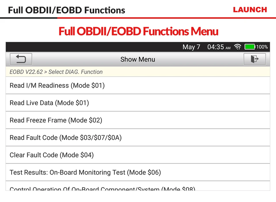 4.Полная диагностика OBD II, Включая EVAP, датчик O2, готовность I/M, состояние MIL, информацию о VIN, тестирование бортовых мониторов и т. д.