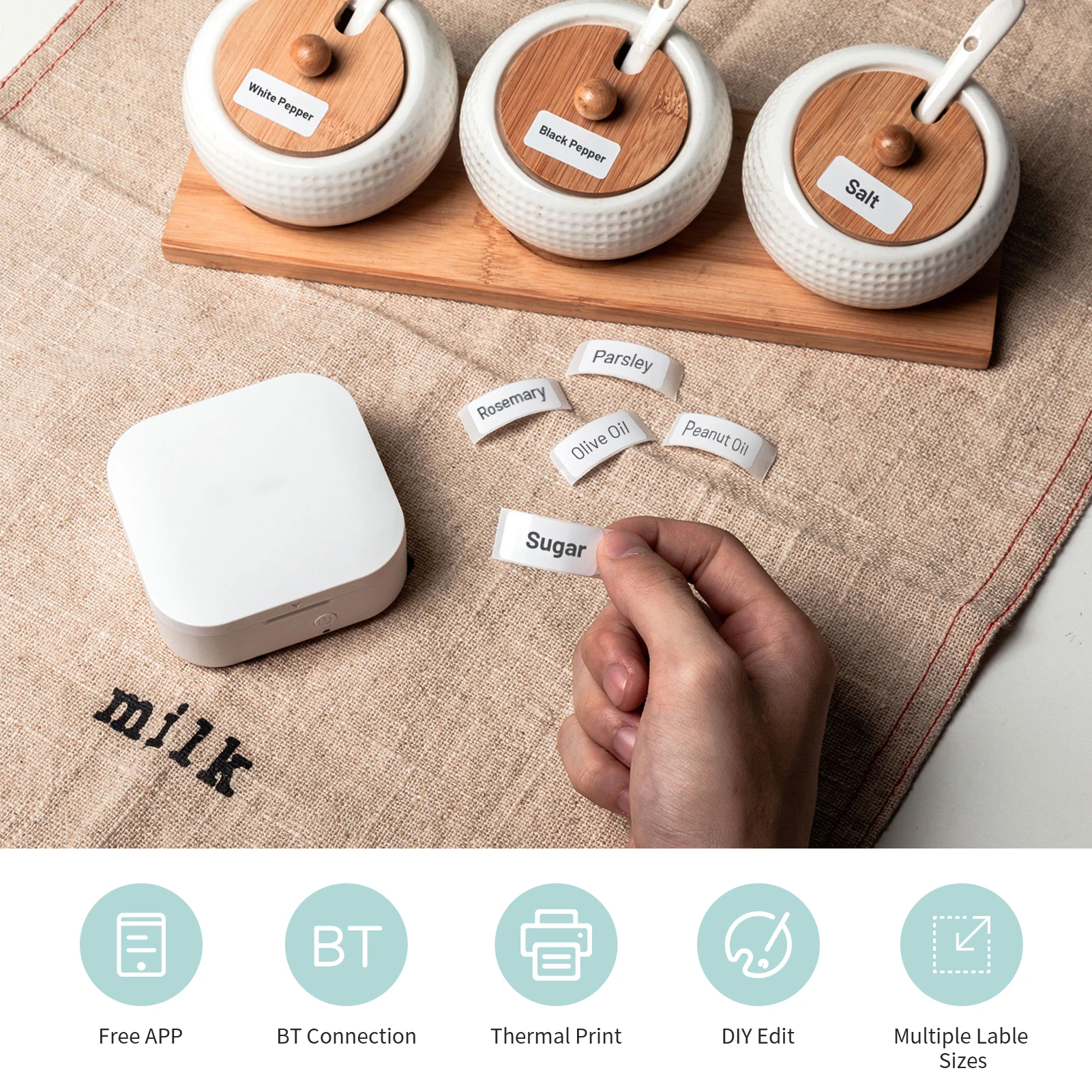 Многофункциональный Принтер этикеток-мини и портативный принтер для этикеток, способный напечатать различные наклейки, такие как ярлык принца, текст, значок, рамка, изображение, время, код 1D, qr-код, линия и т. Д. Широко используется в домашнем хранении, макияжных заметках, журнале, офисе, исследовании.