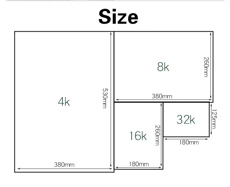 Размер:32K(180*125 мм);16K(180*260 мм);8K(390*270 мм);4k(540*390 мм)