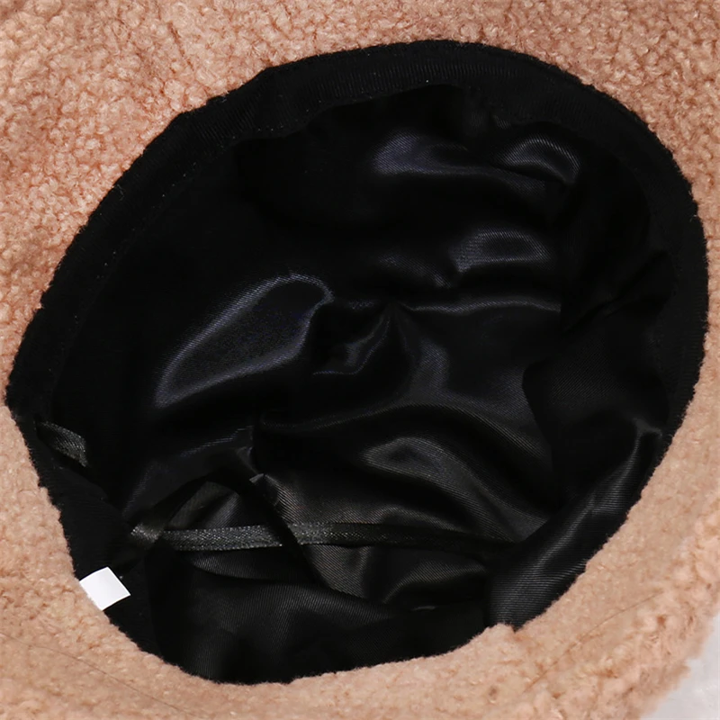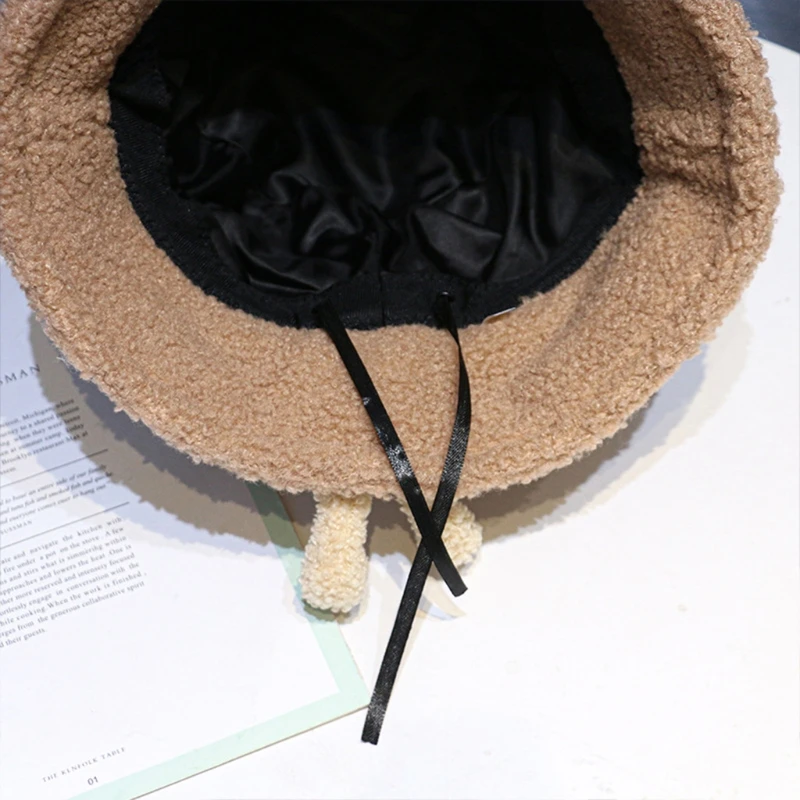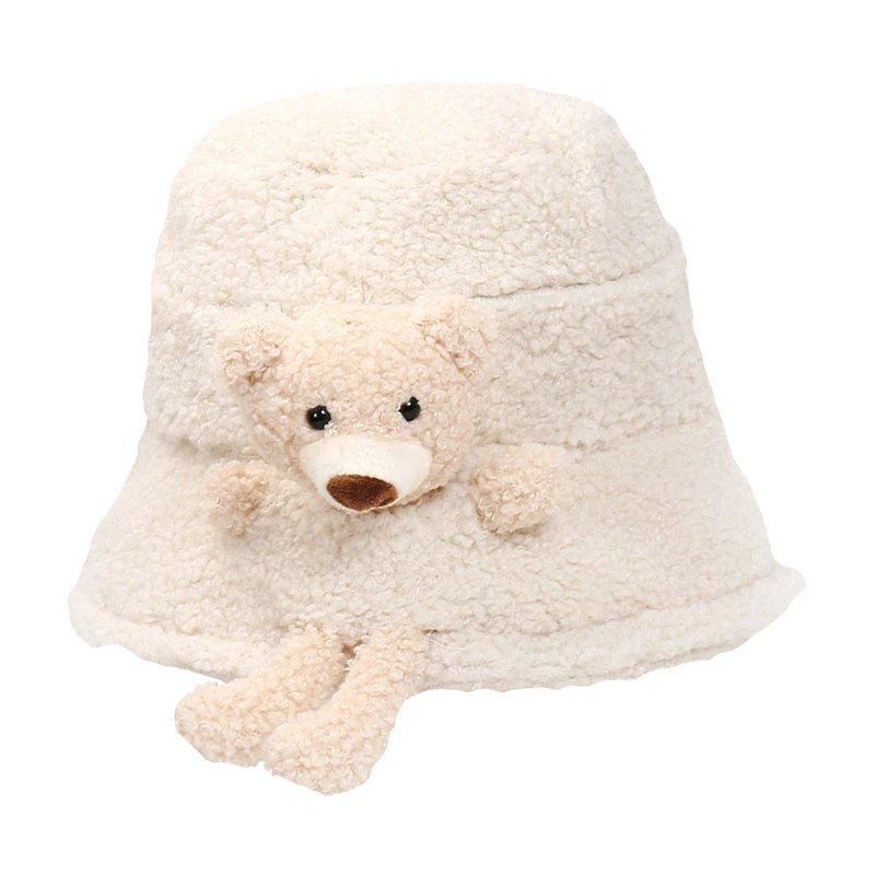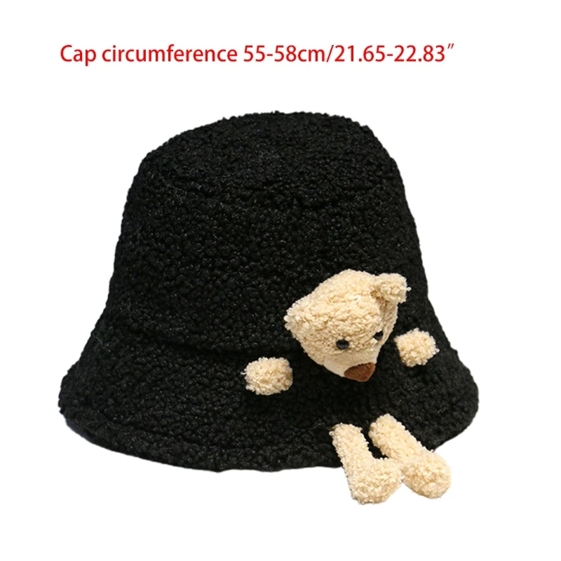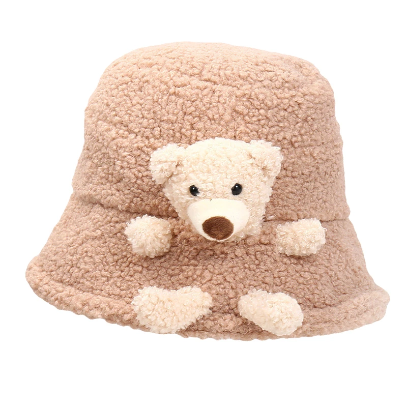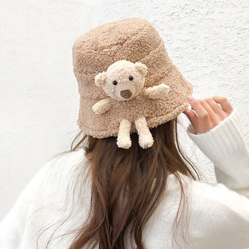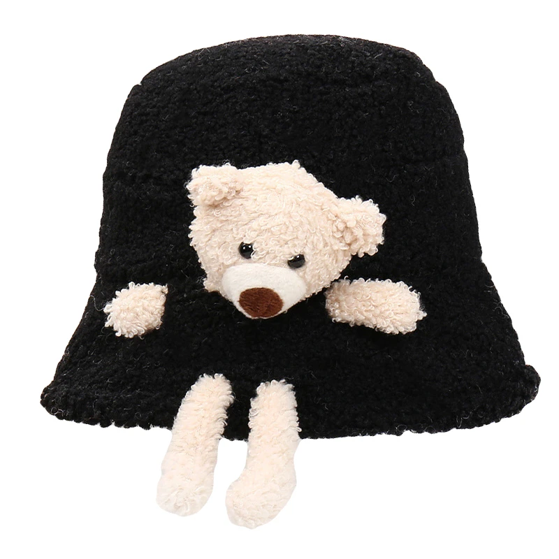 Утолщенная пушистая теплая шапка-ведро, сплошной цвет, милый 3D мультяшный плюшевый мишка украшен.