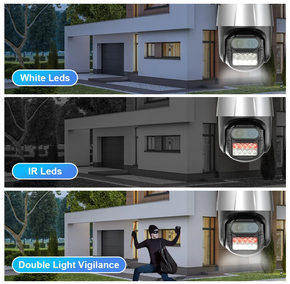 Встроенный литий-красный/зеленый/синий 12 светодиодов, поддерживает полноцветной режим, инфракрасный режим и двойной-подсветка сигнализации Режим (инфракрасная камера с режимом ночного видения отображается в тех случаях, когда не объект движется, И белый свет будет включаться, чтобы переключиться в полноцветной режим после того, как будет обнаружено движение).