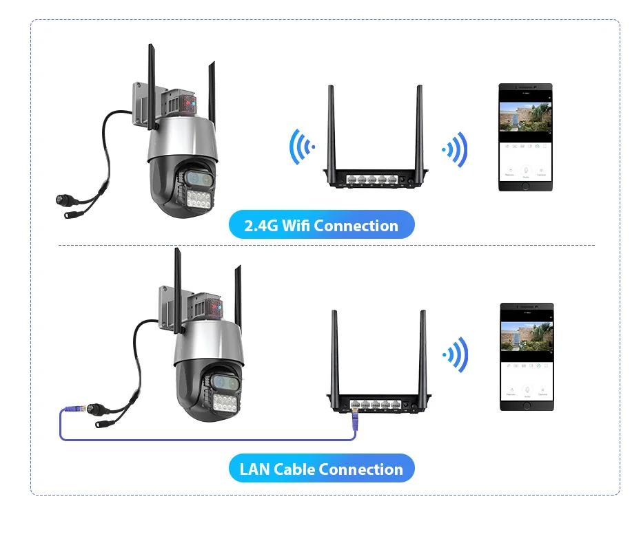 Приведенный в действие DC12V адаптер переменного тока, вы можете подключить камеру к сети Wi-Fi. Вы можете установить соединение Wi-Fi камеры или поиск локальной сети с сетевого кабеля подключены к маршрутизатору, работа с 2,4 г только Wi-Fi (не поддерживает 5G).
