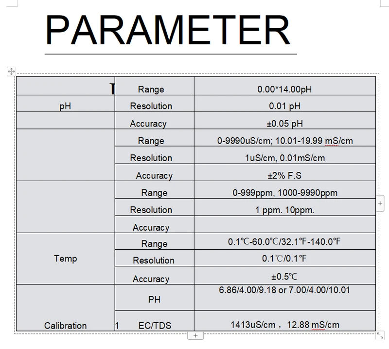 Информация о BLE-9908 (4 в 1 PH/EC/TDS/TEMP тестер качества воды)