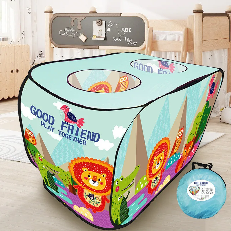 3. Задняя дверь открывается и закрывается крючком и петлей. 2 круглых верхних отверстия для 2 детей, чтобы стоять внутри палатки.