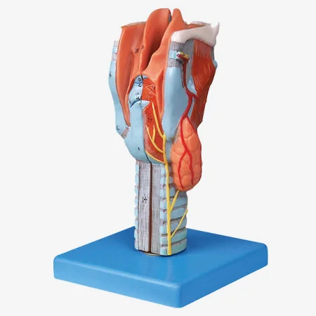 1. Модель размера жизни продольно разделена, чтобы показать детали внутренних структур, включая хрящи гортани, гортанные мышцы, полость гортани, мышцы, сосуды, нервы и щитовидную железу.