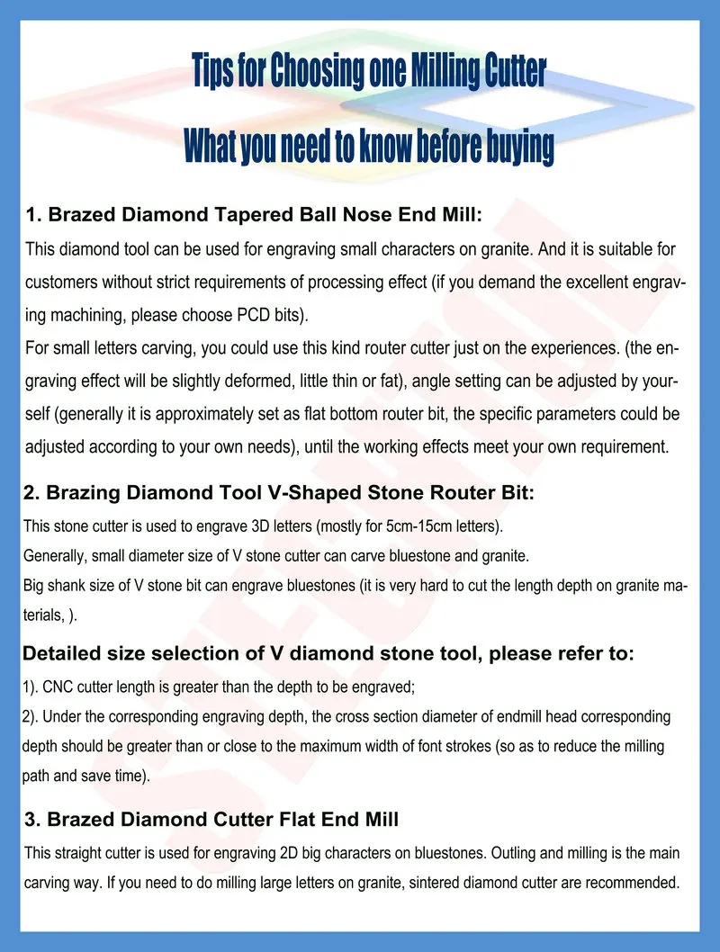 (1) Тип резца гравера: плоский нижний алмазный резец, фрезерный станок с ЧПУ, каменный инструмент.
