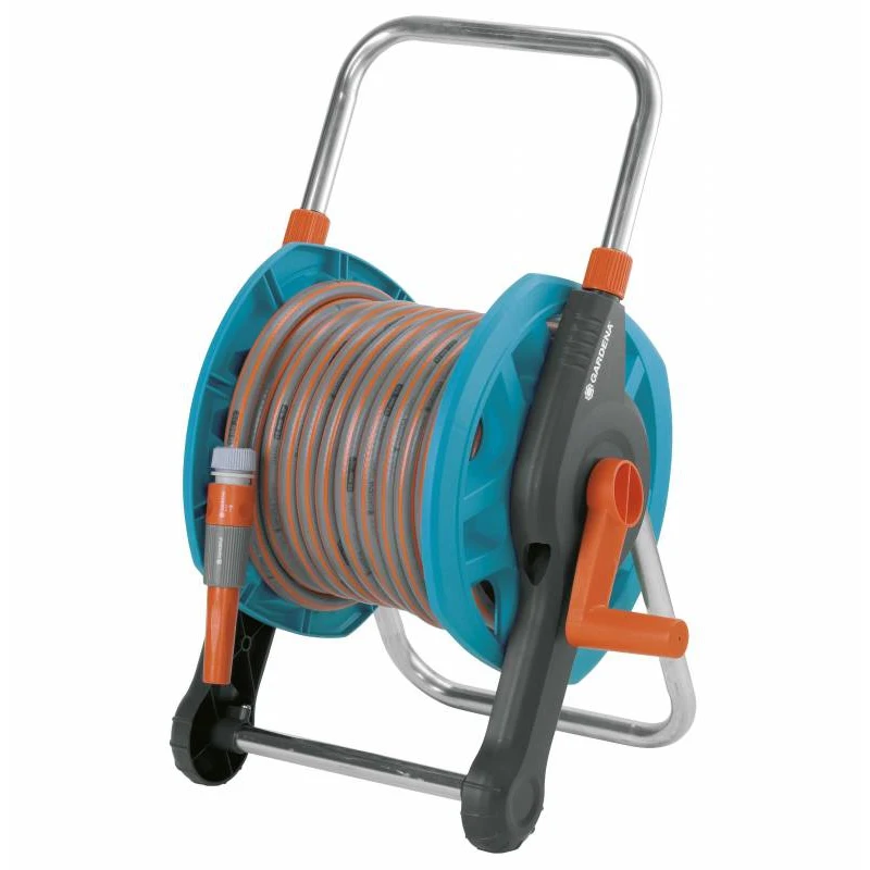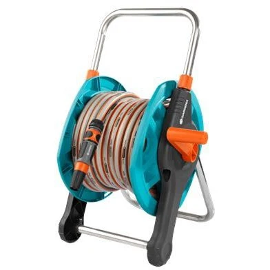 Катушка Gardena 50 Classic с комплектом. В комплект входит: 20 метров шланга Classic 13 мм (1/2"), 1 коннектор стандартный, 1 коннектор с автостопом, наконечник для полива Classic. Вращающаяся ось предотвращает перекручивание шланга при его намотке и размотке.