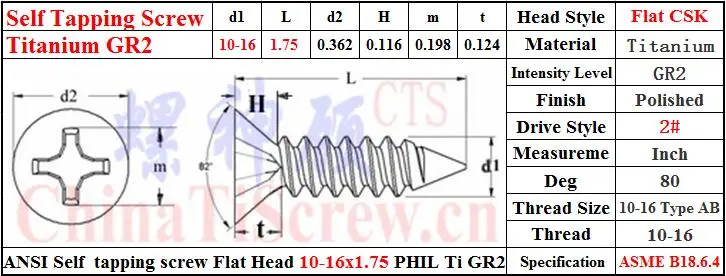 У нас есть ANSI 10-16 саморез Титан винты 10x 1/2 10x 5/8 10x 3/4 10x1 10x1,25 10x1,5 10x1,75 10x2 10x 3 в наличии, по ASME B18.6.4 плоская головка, 2 # Phillips driver,Ti GR2 полированная. Нет магнита.