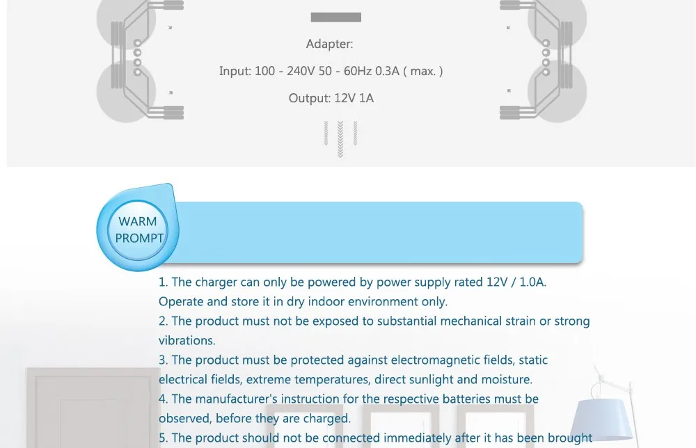 1. зарядное устройство может питаться только от источника питания с номинальной мощностью В 12 В/1,0 А. Работайте и храните его только в сухом помещении.