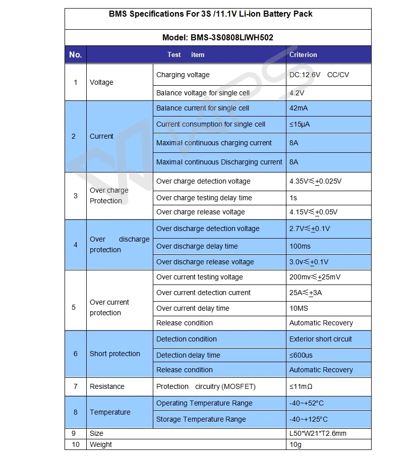 3S Li-Ion BMS параметры: