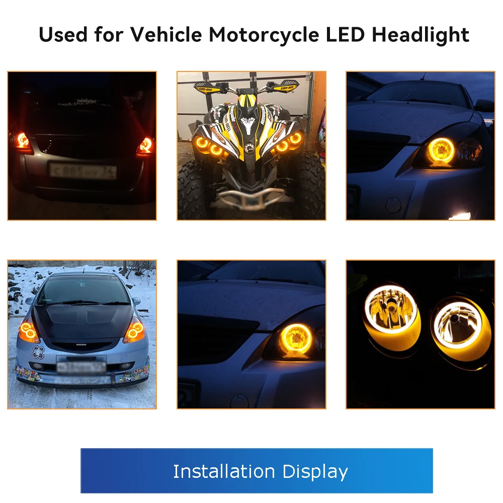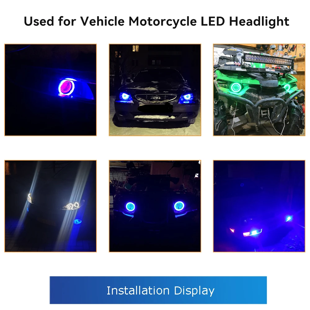 > Применение: ангельские глазки, противотуманные фары, светодиодный фонарь, подходит для автомобиля, автомобиля, мотоцикла, скутера.