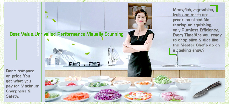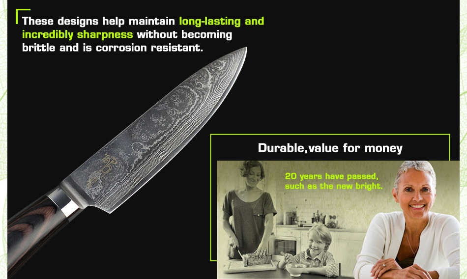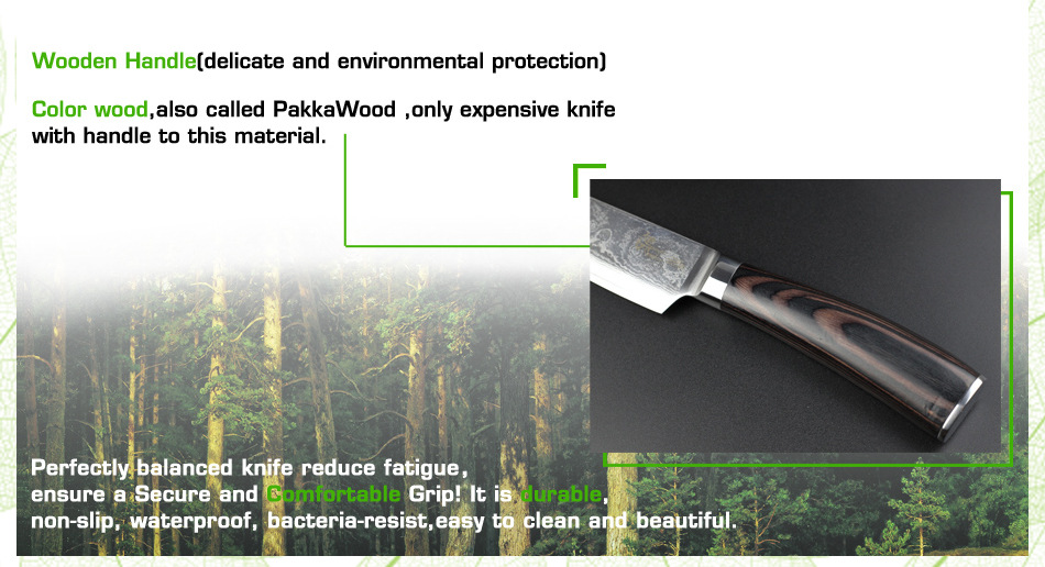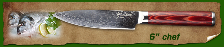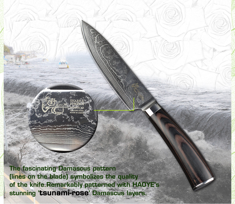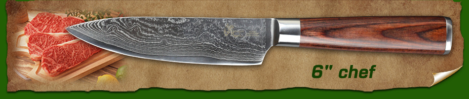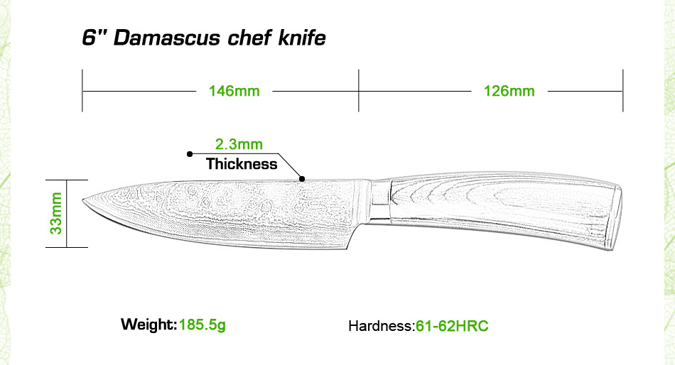 Продукт(6 "дюймов дамасский поварской нож.) Завораживающий дамасский узор (линии На лезвиях «цунами-роза») Произведите впечатление на гостей с вашимВыглядит потрясающе. Символизирует качество ножа. Из высококачественных материалов(VG10 и 73-слой из дамасской стали микро Карбид сталь) ЭкстримРезкостьИ с длиннымиПрочность и долговечность. Ремесленное производство(Специальная Термическая обработка через точный контроль температуры) Имеет небывалую твердость62 по шкале Роквелла (Высокая отключающая способность) . Не становясь ломкими и устойчивыми к коррозии. Деревянная ручка(Деликатная и экологическая защита) Гарантируют безопасную иУдобныйСцепление! Прочный иNon-slip. Подарочная коробка(Черные коробки из гофрокартона). элегантный внешний вид, влагостойкий и ударопрочный.