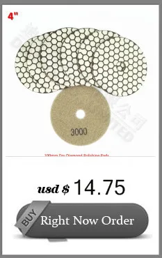 Item:4inches Diamond Flexible Dry polishing pads and rubber backer pad Quantity : 7pcs (#50, #100, #200, #400, #800, #1500, #3000 1pc each) + 1pc M14 Rubber backer Specification: Diameter 100mm/4inch", thickness 1.5mm Application: For granite & marble polishing Feature : Flexible, suitable for different shape polishing Dry polishing, working without water, convenient and less pollution Very competitive at price, Note: You could get 7pcs with mixed grit, for example, 2pcs #800 + 3pcs #1500 +2pcs #3000....Please just place order and leave messages to us. Thank you. <><><><><><><><><><><><><><><><><><> The End of Description <><><><><><><><><><><><><><><><><>