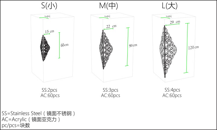 | 1. Длина единицыСм. 2. меткаШт.Количество компонентов каждого размера. 3. Каждый рисунок состоит из нескольких декоративных акриловые зеркала и зеркальной поверхности из нержавеющей стали. Например: SS 2 шт. подставки для 2 шт.Лента из нержавеющей стали. Переменного тока 18 шт. подставки для 18 штукАкриловое зеркало. |