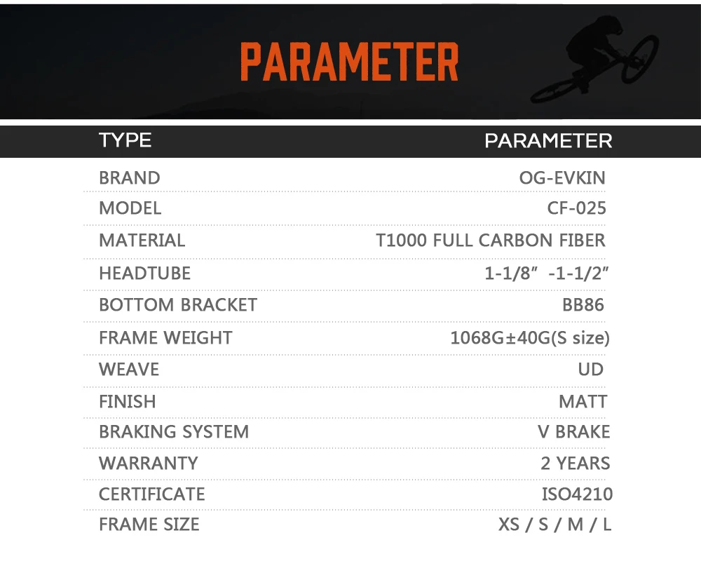 Модель: CF025V Материал: углеродное волокно Головной убор: 1-1/8 "-1-1/2" Нижний Кронштейн: BB86 Вес оправы: 1068 г +/-40 г (Размер: S) Ткань: UD Отделка: матовая Тормозная система: V тормоз Размер оправы: XS/S/M/L Гарантия: два года