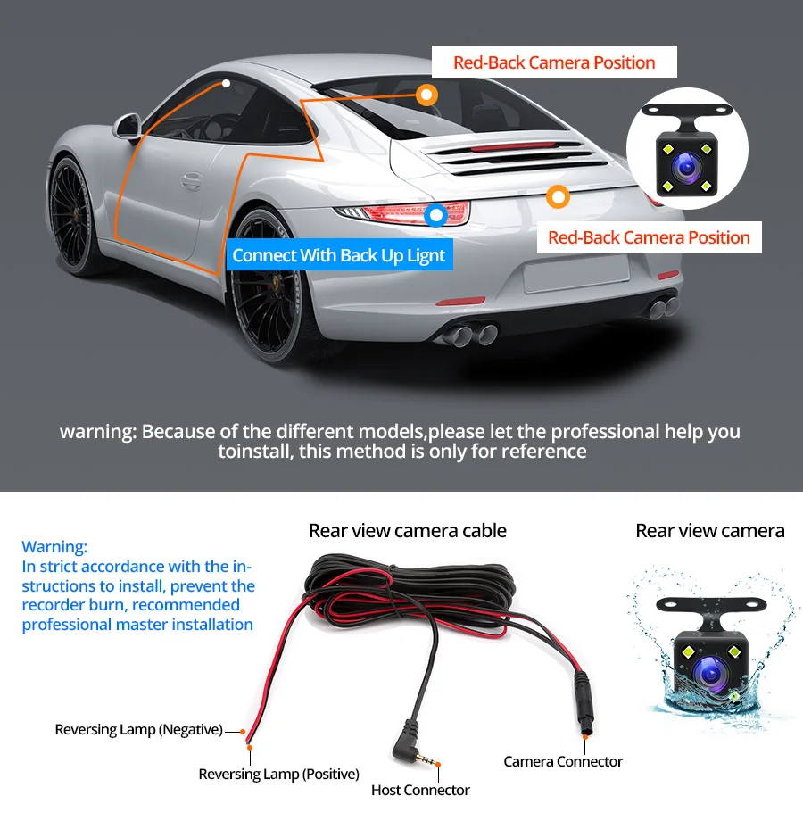 Пожалуйста, подключите красный кабель камеры заднего вида к положительной полюсе питания лампы заднего хода (+). А затем Подключите автомобильное зарядное устройство к прикуривателю для питания автомобильного видеорегистратора. когда вы получите автомобиль на заднем ходу, Автомобильный видеорегистратор автоматически переключается на заднюю камеру с парковочной линией. тогда будет работать функция автоматического заднего хода.