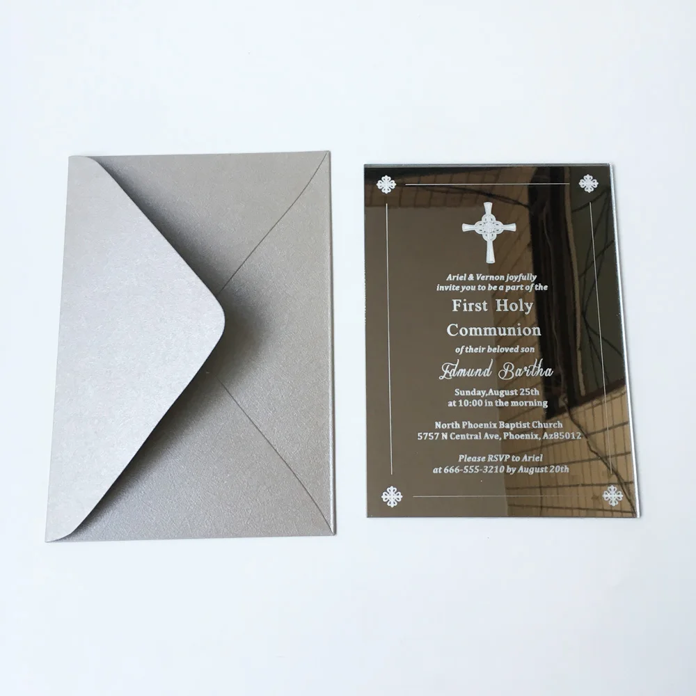 Индивидуальные 5x7 дюймов Серебряное Зеркало акриловое Первое Причастие/Крещение пригласительные карты 100 шт в партии