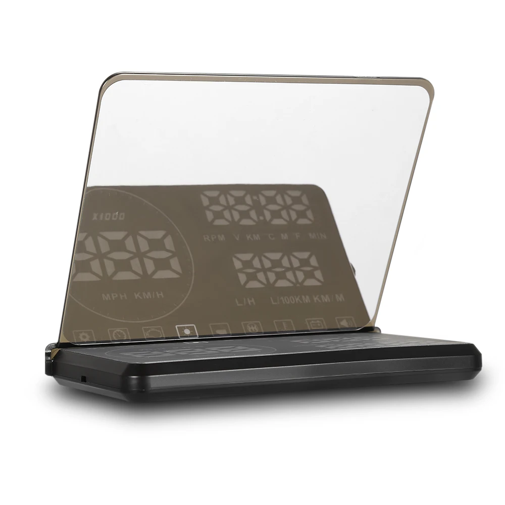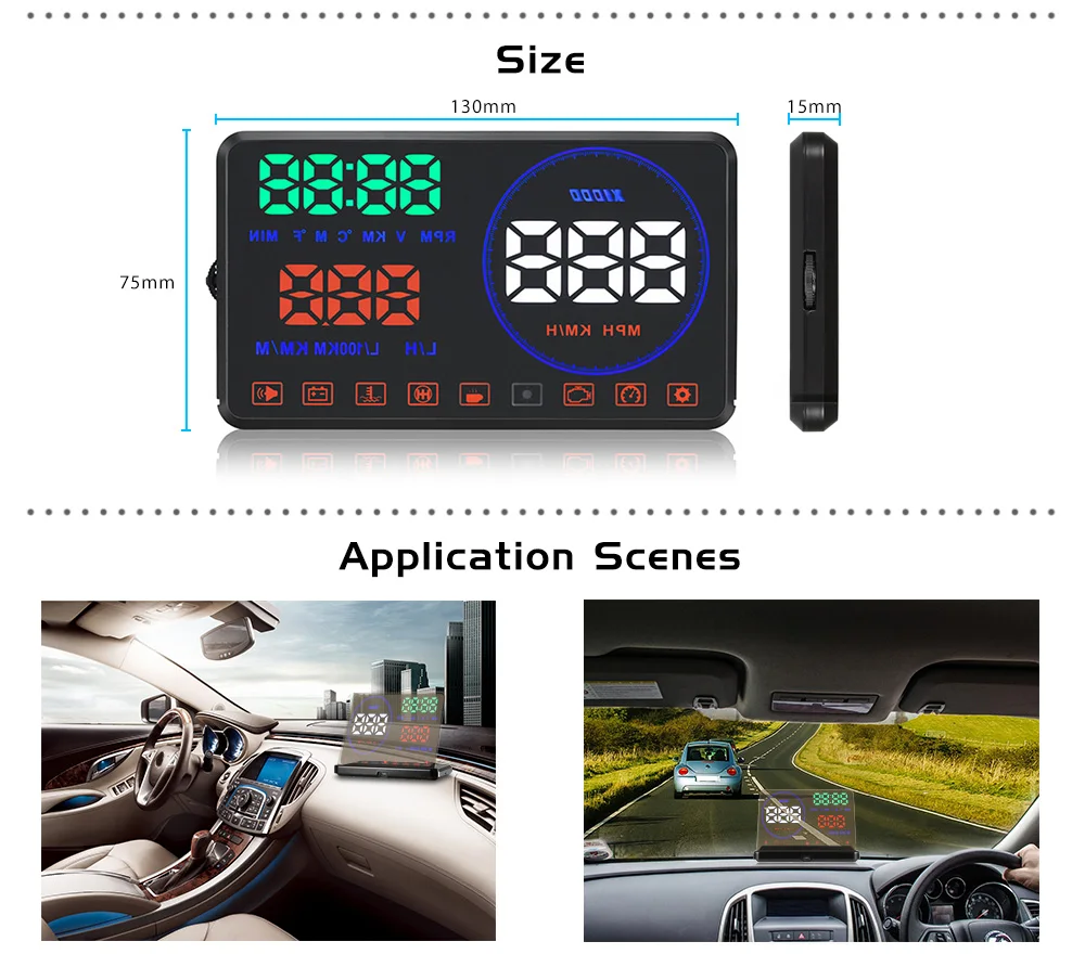 Он отображает данные вождения на лобовом стекле, такие как скорость, об/мин, расход топлива, температура воды, напряжение; избегая водителей становится опасным из-за наблюдения за прибором во время вождения.