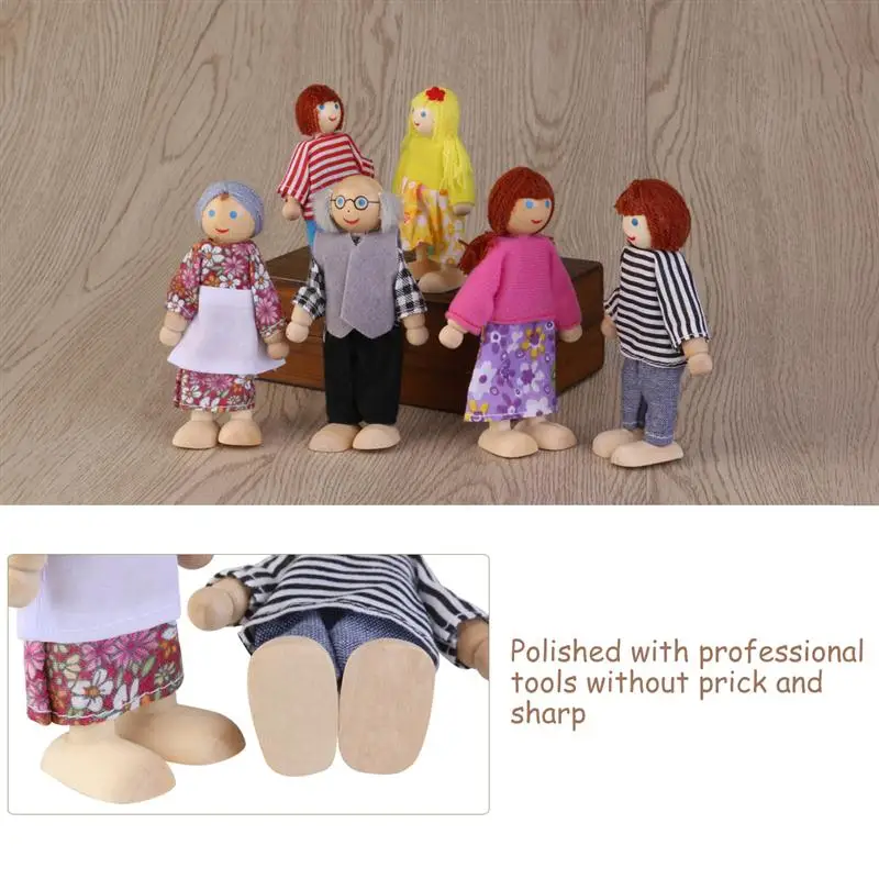 Этот товар представляет собой набор из 6 милых семейных кукол с героями мультфильмов для детей, включая бабушек и дедушек, родителей и двух детей. Он изготовлен из тщательно отполированного дерева с безопасной камерой и гладкой поверхностью, которая подходит для детей. Конечности кукол являются гибкими. Это отличный подарок для ребенка. Кроме того, семейные куклы также служат в качестве милых домашних декораций.
