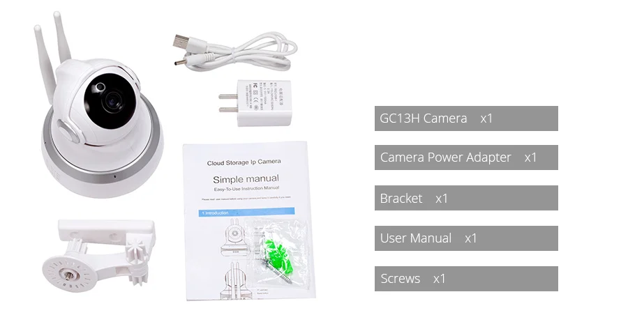 1 x ip-облачная камера, 1 x адаптер питания (Великобритания/Австралия/США/ЕС), 1 x руководство на английском языке