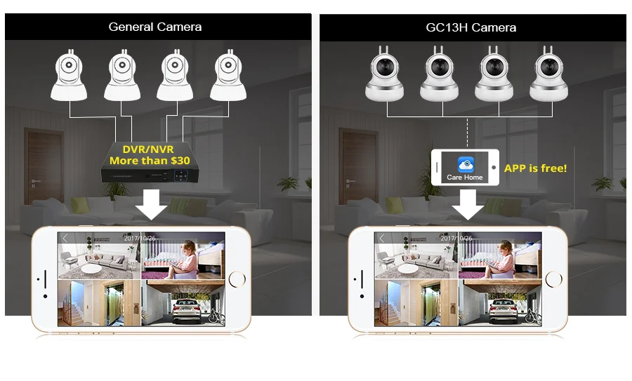 Другие камеры на рынке должны заплатить дополнительные деньги для DVR/NVR для достижения такой функции, наша облачная камера-ваш лучший выбор.