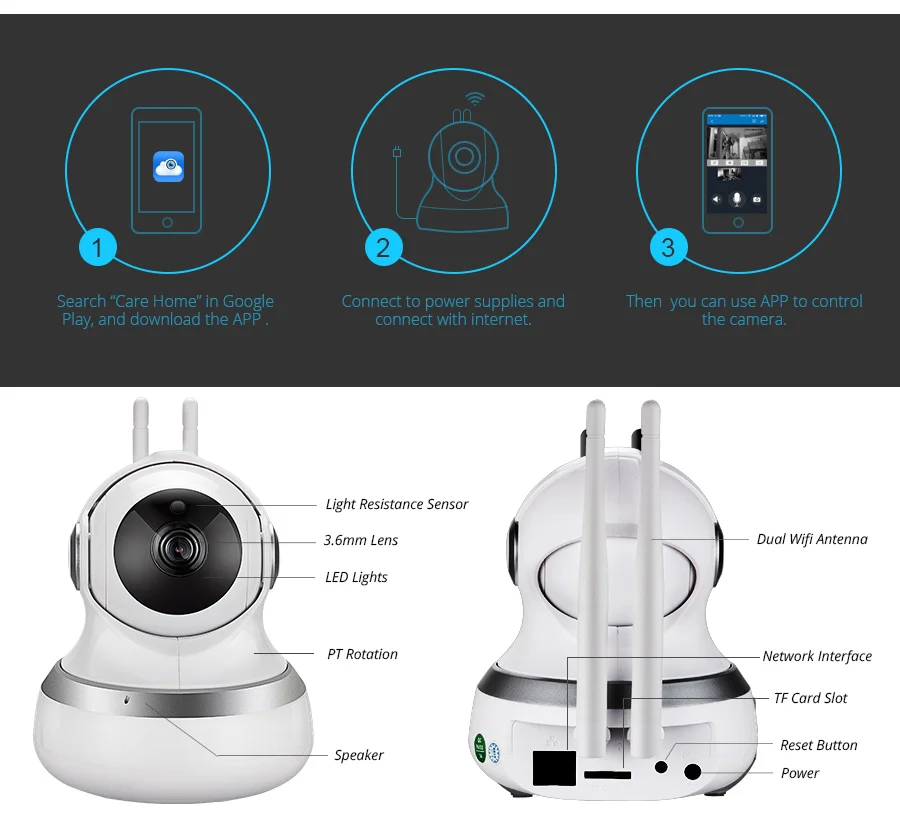 1. Найдите «Care Home» в Google Play и загрузите приложение 2. Подключение к поставщикам питания и подключение к Интернету 3, затем вы можете использовать приложение для управления камерой