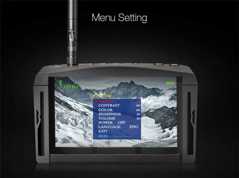Размер экрана: 5,0 дюйма Разрешение экрана: 800*480 (без размытия после увеличения линзы) Яркость экрана: 600cd/m2 со специальной подсветкой высокой яркости для наружного FPV Угол обзора: 140/120 градусов (горизонтальный/вертикальный) |