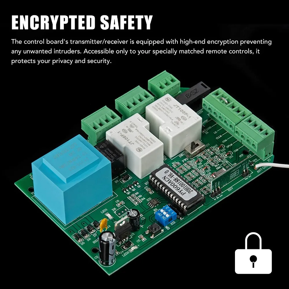 Он работает только с нашим собственным пультом дистанционного управления; Не совместим с другим пультом дистанционного управления! Батарея в комплект не входит;Небольшие электрические чипы и другие предметы на плате могут быть изменены без уведомления Покупателя, если это не влияет на функцию.Время работы регулируется.Выходной крутящий момент двигателя регулируется.Клавиатура/однокнопочный интерфейс.Фото луч безопасности луч интерфейс.Пользователь может выбрать функцию автоматического закрытия.Светодиодный индикатор указывает на рабочее состояние.Каждая панель управления может выучить 25 единиц дистанционного управления.Интерфейс для однокнопочного/трехкнопочного переключателя, инфракрасного датчика, сигнальный светильник