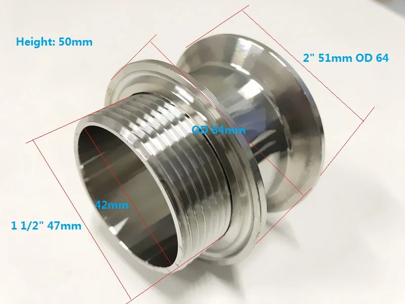 Тройной зажим адаптер 2 "(51 мм) OD64 * 1 1/2"(DN40)47 мм внешняя резьба с силиконовой прокладкой или гайкой из нержавеющей стали 304, тройной зажим мужской адаптер, высота 50 мм