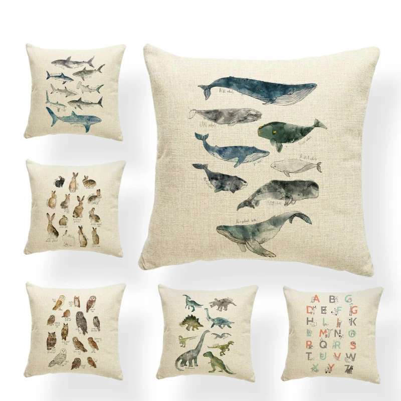 Милый Комплект подушек с животными, полярный медведь, убийца, Кит, Нарвал, лиса, пингвин, сова, декоративная подушка для дивана, наволочка из полиэстера, льняная подушка, панда, динозавр, кролик, олень, Акула, ленивый Лев, тигр, леопард, кот, волк