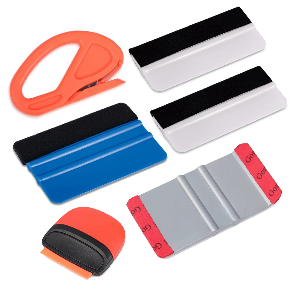 1. Product Type: Car Wrapping Tool Kits 2. Material:Plastic, felt 3. Car Compatibility: Universal 4. Compatibility: Suitable for application of all types of window tint film, paint protection film, decals, solar film, wrap film Feature: 1.Durable squeegee made from high quality rubber/plastic. 2.Scrape off the bubbles downright under the film, prevent glass car body and film 3.Scratch-less, no marring or marks, just smooth motions that easily glides across vinyl films and painted surfaces 4.Lightweight makes it easy to use and store in smaller spaces 5.Convenient to use Application: 1.Old vinyl film and glue removing,car cleaning brush car styling tools 2.Automotive film pasting, building film pasting special tools, Vinyl film install, window tint film install, wall paper installation,car wrapping tools 3. Household glass wiper use, the car home,building tools, industrial tools. 4.Mobile phone screen protection install 5.Paper, film ,stickers cutting tool ... Package includes: 1 x blue felt squeegee 2 x white felt squeegee 1 x orange mini cutter 1 x 135° edged felt scraper 1 x razor scraper