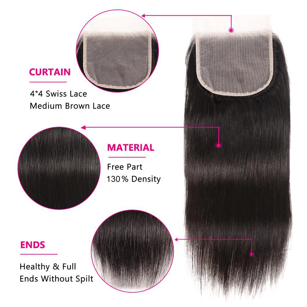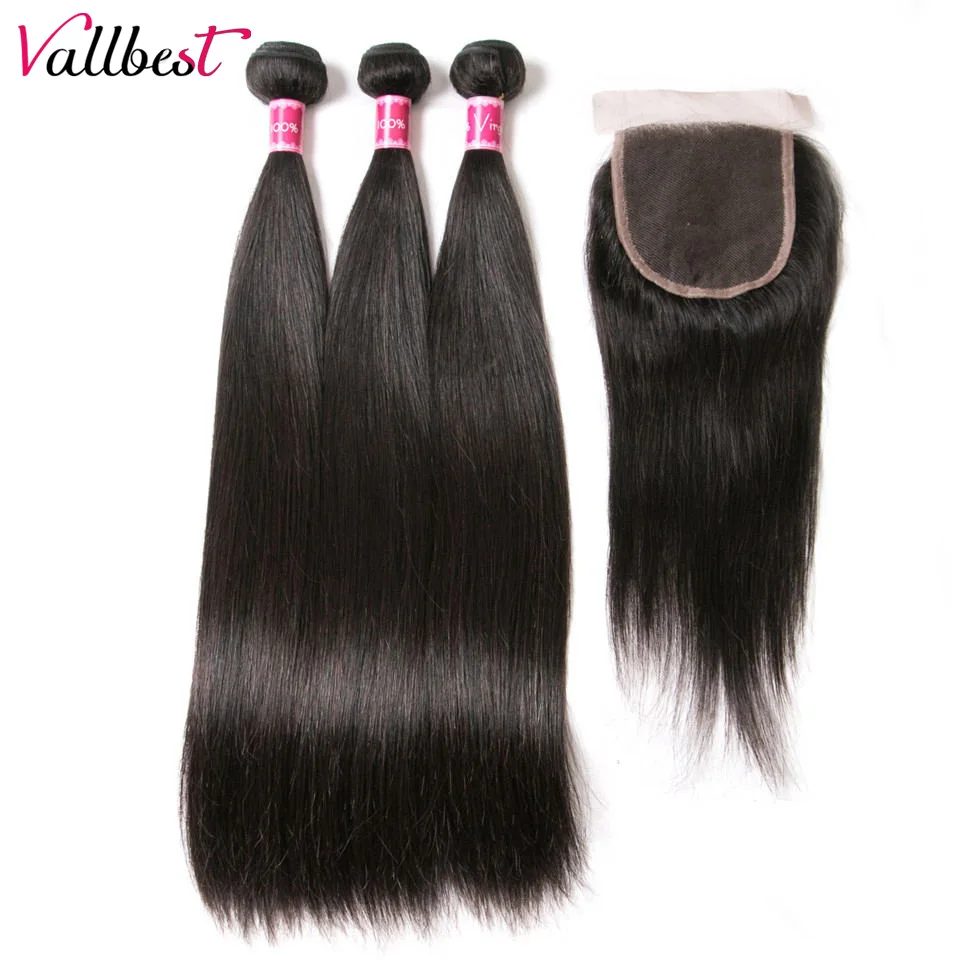 Vallbest прямые пряди волос с закрытием индийские человеческие волосы 3 пряди с закрытием Remy волосы для наращивания свободная часть кружева
