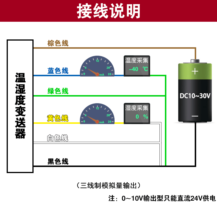 Например, диапазон от-40 до + 80 градусов Цельсия, 0-10 в выход, когда выходной сигнал 5 В, Вычислите значение текущей температуры. Диапазон температур составляет 120 градусов, выраженный в качестве сигнала напряжения 10 В, 120 градусов/10 В = 12 градусов/В, то есть, напряжение 1 в означает изменение температуры 12 градусов. Значение измерения 5 В-0 В = 5В 5В * 12 градусов/В = 60 градусов. 60 + (-40) = 20 градусов, температура тока 20 градусов.