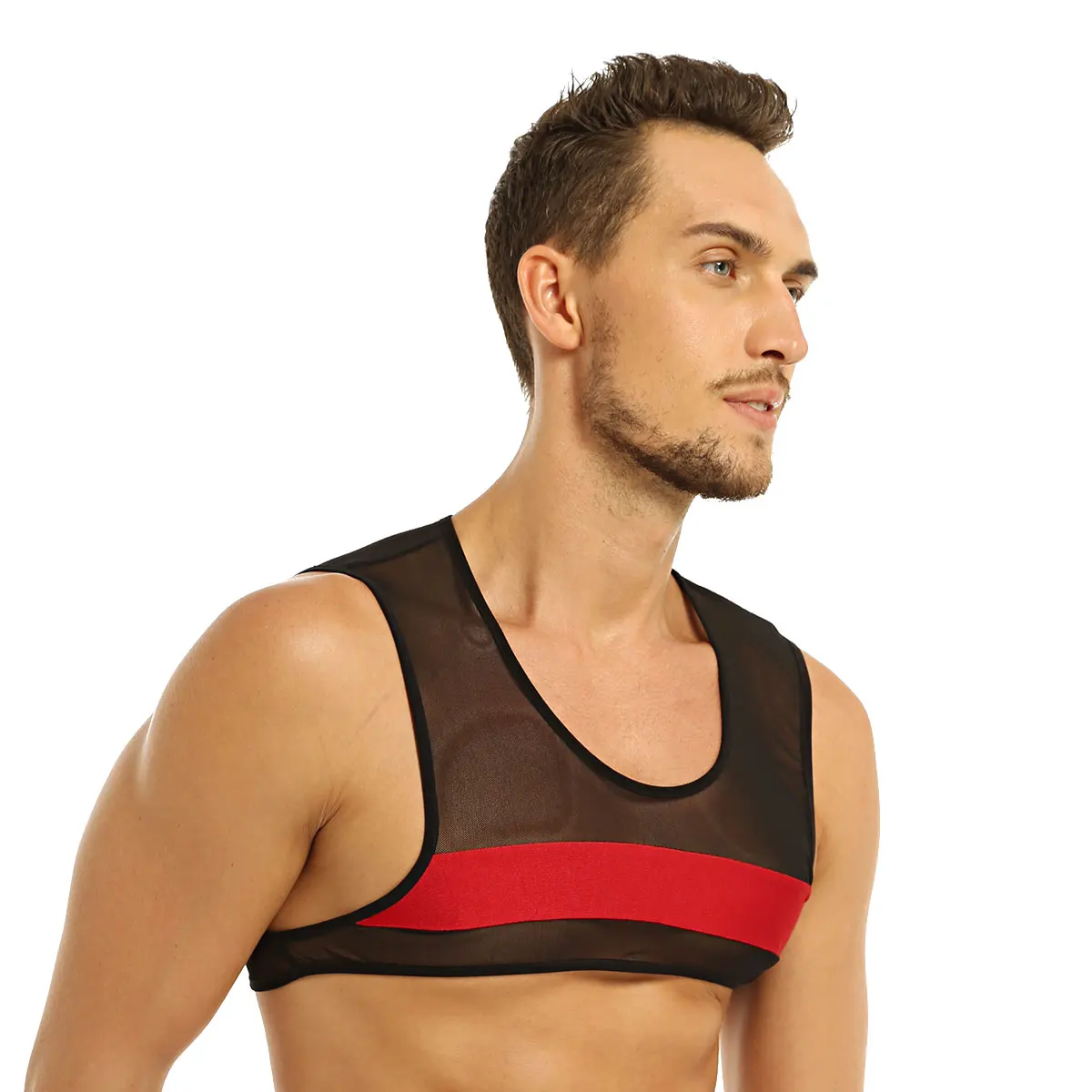 Сетчатый Дизайн, без рукавов и с круглым вырезом, с красной контрастной отделкой.