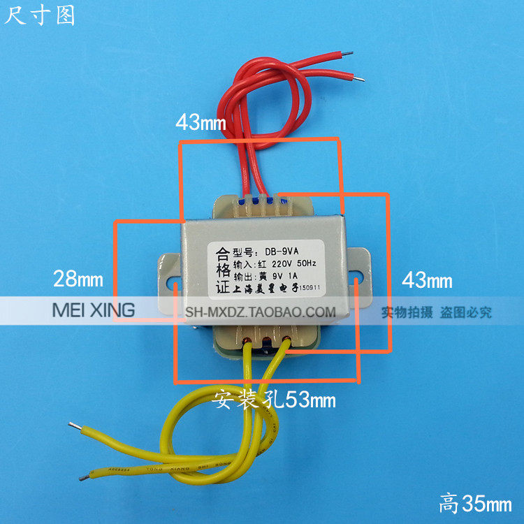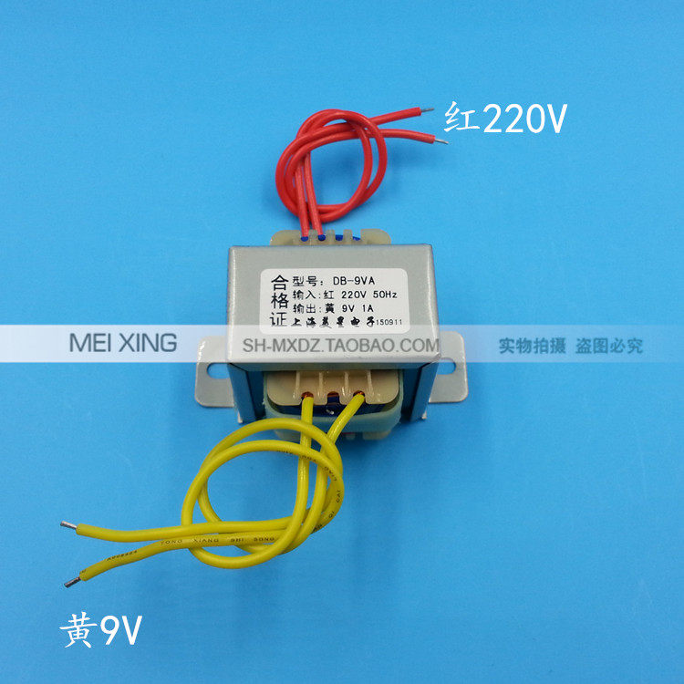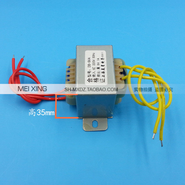 Название продукта: силовой трансформатор Модель продукта: EI41 * 25Входное напряжение: AC220V 50 Гц длина входной линии: 170 мм (красный)Выходное напряжение: 9 В переменного тока Длина выходной линии: 170 мм (желто-желтый)Номинальная мощность: 9VA 1A Вес: около 0.25GKРазмер внешнего вида: 43x43x35 мм Монтажное отверстие: 53 ммФорма конструкции: однофазный трансформатор характеристика частоты: частота мощности.Материал: медная эмалированная проволока + Лист кремниевой стали + устойчивый к ржавчине зажим для верховой езды + огнестойкий Скелет + супер мягкий электронный высокотемпературный провод.