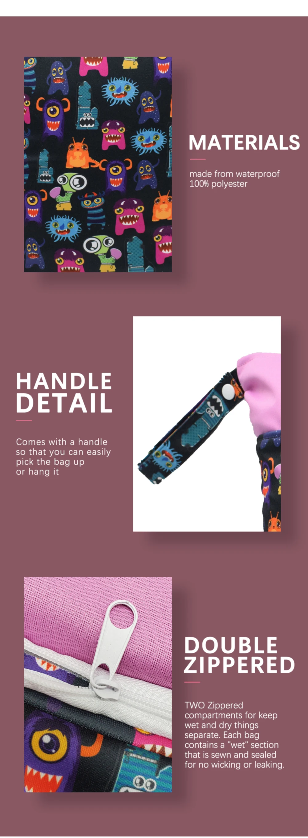 1. Влажная сухая сумка для подгузников изготовлена из качественной ткани из ТПУ прочного водонепроницаемого материала.
