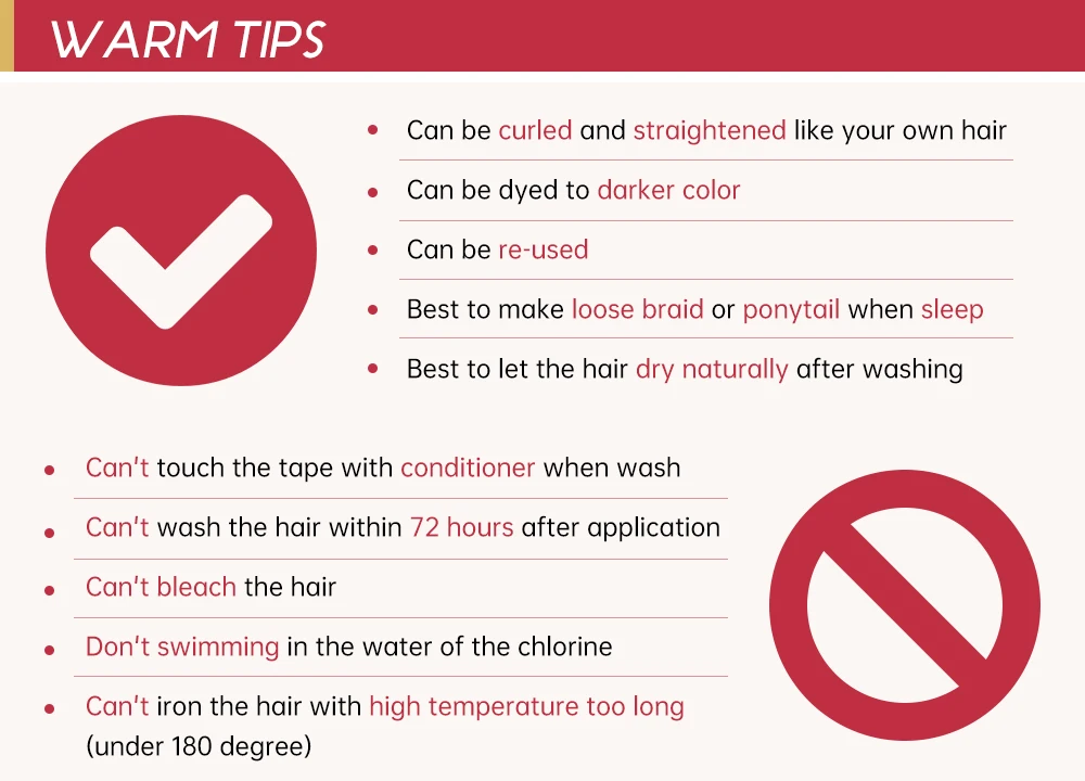 A:Не мойте волосы в течение трех дней после первой установки. Используйте Средний шампунь для теплой воды и завивки волос. И никогда не используйте фен или щипцы слишком горячими. Не забудьте также нанести волосы на чистые и некондиционные волосы. Для лучшей производительности, пожалуйста, нагрейте ленту перед нанесением.