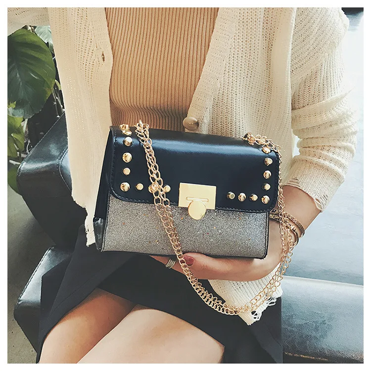 Новые модные женские сумки на плечо с цепочкой с заклепками, разноцветные женские сумки-мессенджеры с клапаном для женщин 2018 Bolsa Материал: искусственная кожа Размеры: 20*16*10 см Открытие: молния 4 цвета доступны