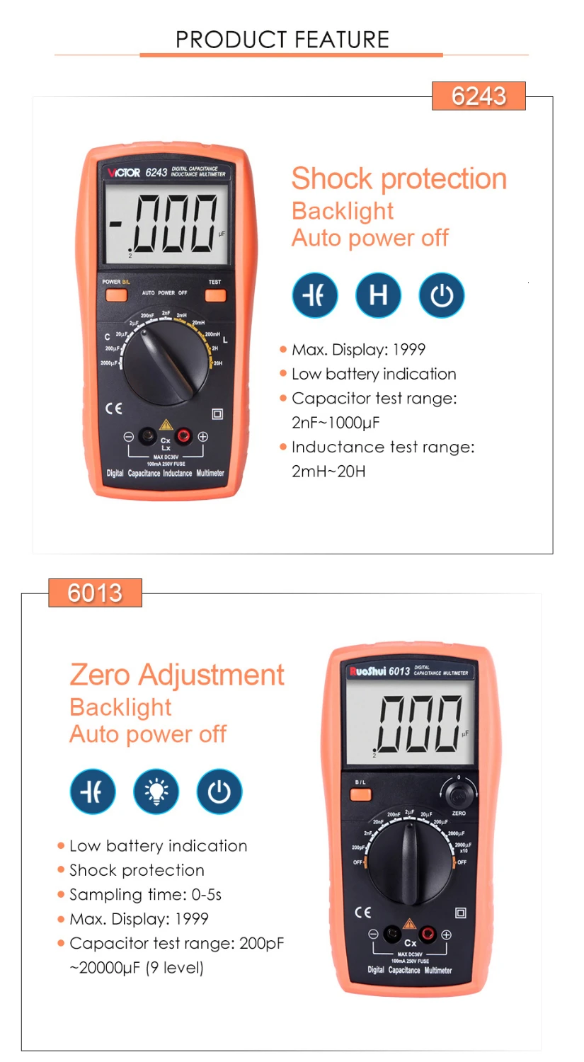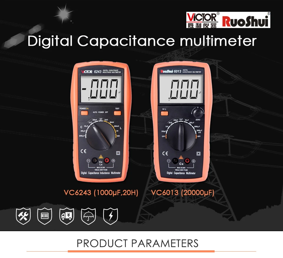 Victor Instruments посвятил себя разработке и производству измерительных приборов более 30 лет. VICTOR также стал ведущим брендом для измерительных приборов в Китае, но RuoShui новый бренд будет использоваться для замены VICTOR на международном рынке постепенно. Здесь мы заявляем, что в течение переходного периода вся продукция, продаваемая в официальном магазине RuoShui, является оригинальной продукцией, но будет поставляться под логотипом VICTOR или RuoShui (зависит от наличия товара), И наслаждайтесь тем же послепродажным обслуживанием и политикой обеспечения качества.