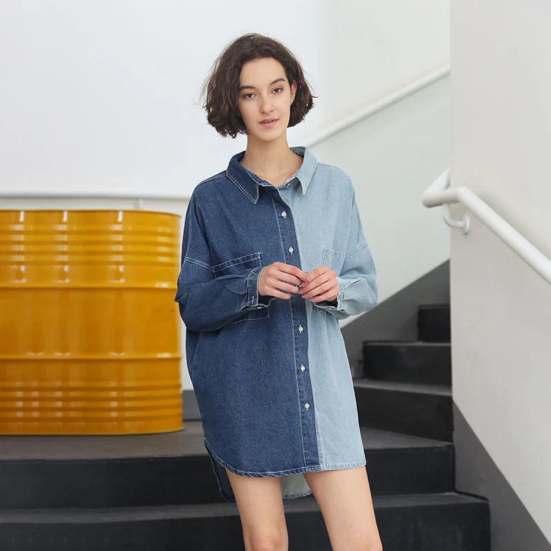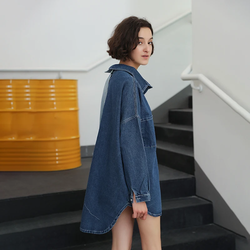 Женская Джинсовая длинная рубашка повседневная синяя джинсовая блузка с