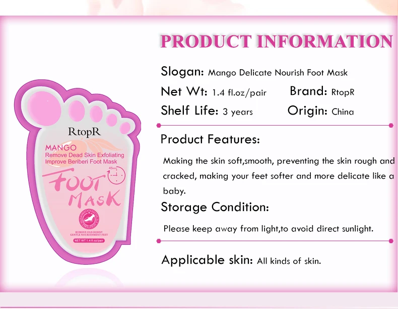 1. Пожалуйста, внимательно изучите Сью этого продукта, рекомендуется использовать горячую воду для замачивания ног или после купания, эффект будет лучше 2. Выньте маску для ног, сначала распределите эссенцию в сумке, равномерно Разгладьте, затем порежьте рот сумки и Наденьте на босую ногу, это похоже на носочки. 3. Наденьте маску для ног, а затем Наденьте плотные носки снаружи, чтобы основная часть стопы была близка к коже, ожидая 45-60 минут 4. Через 45-60 минут снимите мембрану и снимите краску с ног водой, ноги не реагируют. 5. Подождите 4-7 дней, после чего будет небольшое шелушение стопы. Вы можете правильно мыть ноги в этот период После начала пилинга, Замочите ноги в горячей воде на 30 минут ночью, Это тесто, чтобы замочить ваш праздник каждый день, это может ускорить обмен омертвевшей кожи и сделать пилинг быстрее