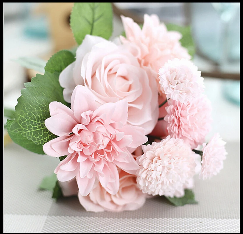 1. Искусственные розы и цветы Далии, хорошо сделанные и яркие, выглядят как настоящие.