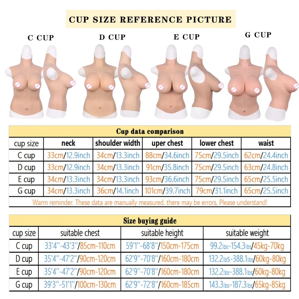 У нас есть много различных силиконовых чашек для груди на выбор. Различные силиконовые чашки для груди подходят для разных размеров тела. Наша силиконовая форма груди имеет сильное удлинение. Если размер вашего тела не превышает размер продукта 30 см, он подходит для вас, если размер вашего тела превышает 30 см, вы будете носить очень плотно, это может не подойти для вас, пожалуйста, будьте осторожны, чтобы купить. Примечания: Наши силиконовые формы груди продукты производятся, обрезаются и измеряются вручную, с небольшими ошибками.