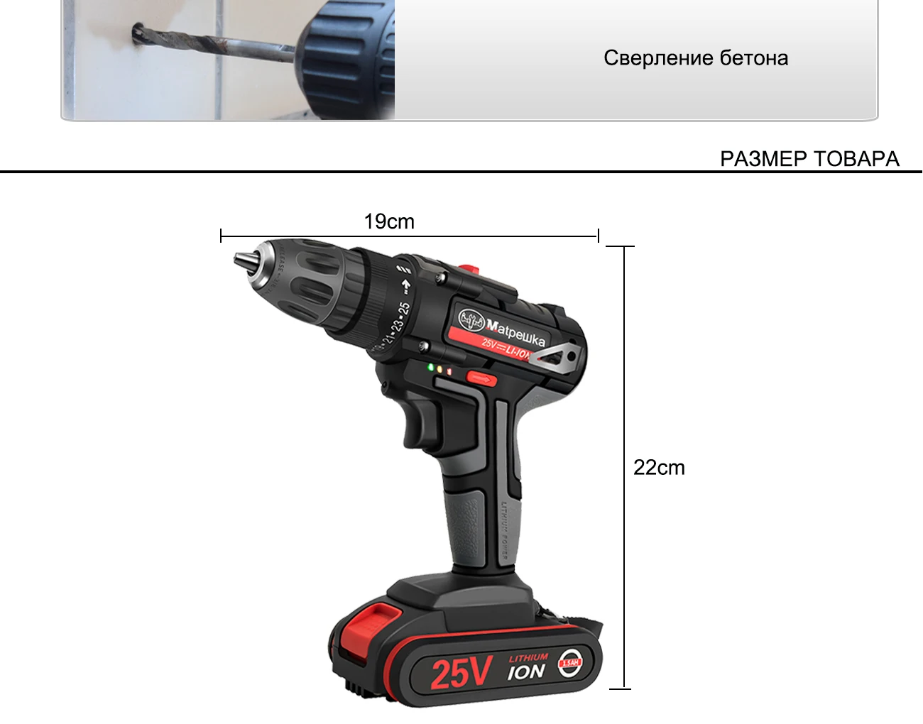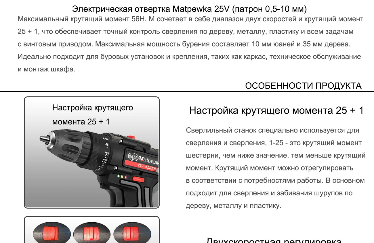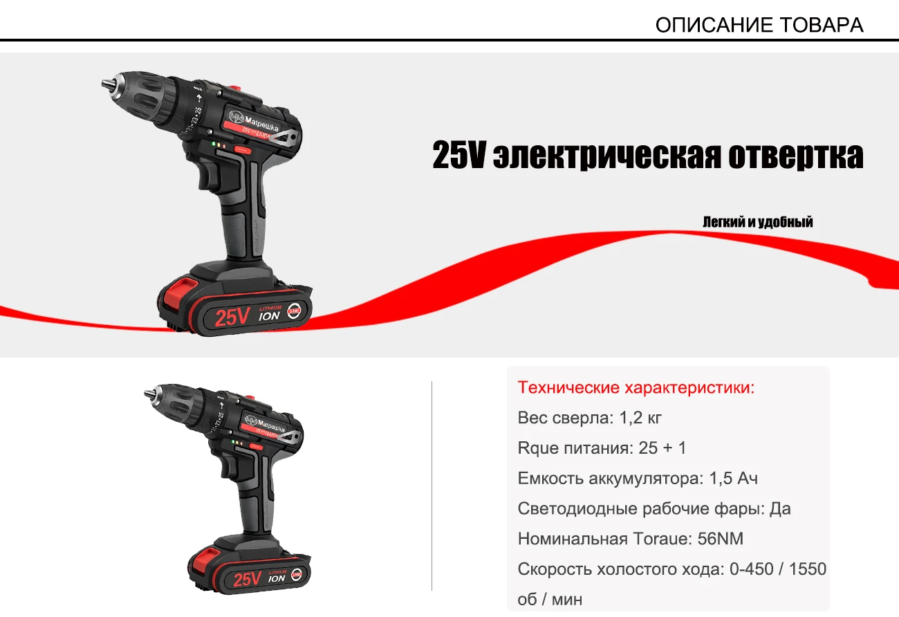 25 в Бытовая Беспроводная электрическая отвертка ручная электрическая дрель перезаряжаемая литиевая батарея электрические инструменты тканевая сумка + подарок Преимущества Введение: Объем работы: сверла стен, сверла металла, сверла дерева, сверла пластика, скручивания винтов... 1. Реверсивный. Автоматический картридж дизайн. 2. Бесступенчатая. 3. 19 Регулировка крутящего момента. 4. Водонепроницаемый, падение, мощность утечки. 5. ECP: устройство защиты аккумулятора для предотвращения перегрузки батареи, перегрева и глубокого разряда. 6. Встроенный светодиодный фонарь для освещения рабочей области также может быть ночная работа. 7. Витая мягкая дверная ручка-скоба CST для обеспечения превосходного сцепления и комфорта. 8. Быстрая медленная регулировка. 9. Примечание: Все подарки будут отправлены случайным образом. Будут некоторые другие. Пожалуйста, знайте это. 10. Примечание: Внутренняя батарея отмечена 3,7 в * 6 = 22,2 в; При заполнении аккумулятора составляет около 4,2 в * 6 = 25 В. 11. Сверлить стены должны быть оснащены профессиональная дрель бит, пожалуйста, примите к сведению Упаковочный лист (комплект 1): Электродрель отвертка * 1 Зарядное устройство * 1 Инструкции * 1 Слинг * 1 Батарея * 1 Подарок: Головка отвертки * 11 шт. Многофункциональный бит * 1 Тканевая сумка * 1 Упаковочный лист (комплект 2): Электродрель отвертка * 1 Зарядное устройство * 1 Инструкции * 1 Слинг * 1 Батарея * 2 Подарок: Головка отвертки * 11 шт. Многофункциональный бит * 1 Тканевая сумка * 1 Покупатель, друзья, обратите внимание, что товар содержит батареи, специальные методы доставки, срок доставки больше, чем средний продукт, пожалуйста, знать