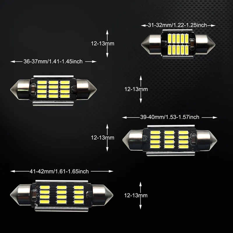 Перед покупкой проверьте и подтвердите правильный размер лампы, необходимой вашему автомобилю. Полная безошибочность для большинства транспортных средств, но безошибочность может ограничиваться несколькими новейшими транспортными средствами, особенно новейшими европейскими транспортными средствами. Автомобили Volkswagen не используют эти лампочки в качестве подсветки номерного знака. Лампы Festoon 31 мм-32 мм лампы базового освещения = DE3175, DE3021, DE3023, 3021, 3022, 3175, 6428, 6430, 7065 Гирлянда 36 мм-37 мм лампы базового освещения = 36 мм 37 мм 38 мм 39 мм 40 мм 6411 6413 6418 C5W DE3174 DE3423 DE3425 DE3425 DE6423 3423 3425 6423 6461 6475 6476 11005 12854 12844 или 7456 лампы Гирлянда 39 мм-40 мм лампы базового освещения = 239, 272, C5W, C10W, SV8.5 Лампы Festoon 41 мм-42 мм лампы базового освещения = 211-2, 212-2, 2112, 2122, 214-2, 6411, 560, 569 или 578. [Простая установка Plug-N-Play] без ошибок canbus, Plug-N-Play, неполярная конструкция, простая установка, без проблем Замените оригинальную галогенную лампу. [Предоставление ответственного послепродажного обслуживания] гарантия 1 год, отсутствие хлопот при возврате или обмене. И предлагаем 100% бесплатную пожизненную техническую поддержку, по любым вопросам, пожалуйста, не стесняйтесь обращаться к нам по электронной почте, наша техническая команда готова помочь!
