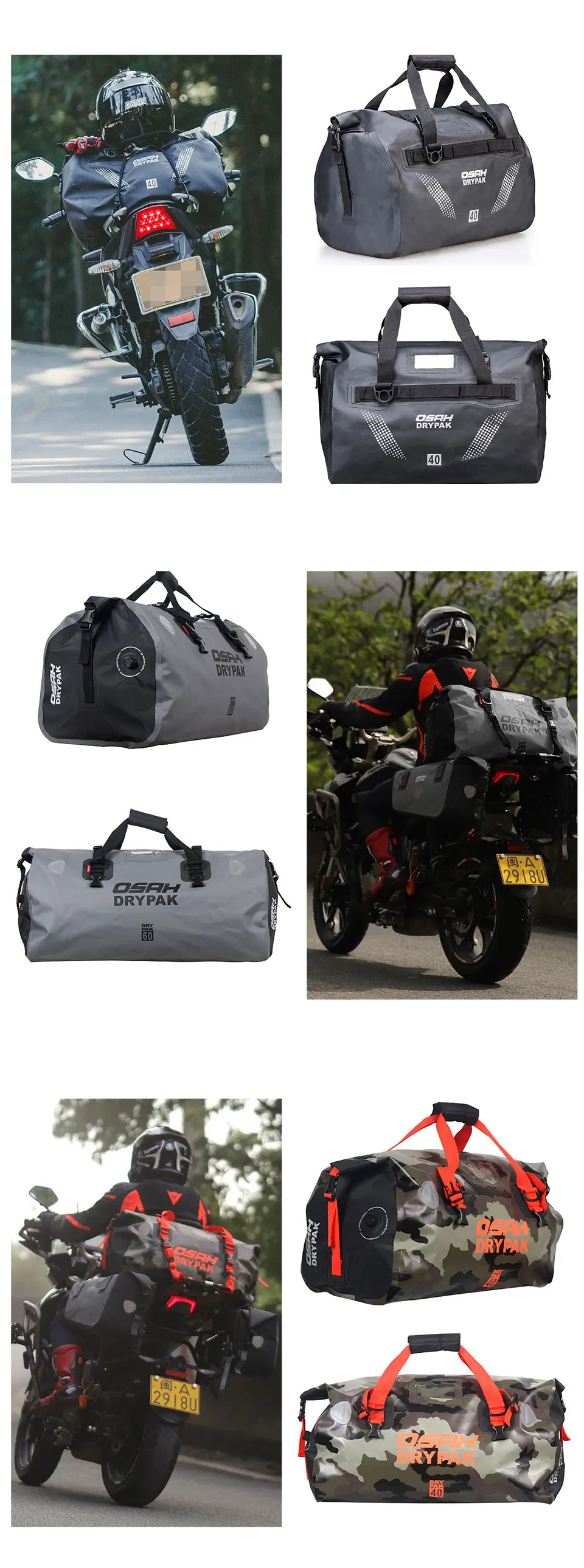 Brand:OSAH DRYPAK Material Type:500D Waterproof fabric,PVC Type:Motorcycle Tail Bag/Motorcycle Rear Bag/Travel bag/Dry Bag/Duffle bag/Waterproof bag/Motorcycle back seat Bag Product Name:Motorcycle Tail Bag/Motorcycle Rear Bag/dry duffle bag/Waterproof bag Color:Black/Yellow/Gray/Blue/Orange/Green/Camouflage Capacity:25L/40L/60L Application:Motorcycle,Kayaking, Rafting, Boating, Hiking, Camping, Fishing, Snowboarding, Canoeing etc Protection:Waterproof Protect for the phones, camera, clothes, food, wallet and etc Shoulder Strap:Comes with an extra high quality removable adjustable shoulder strap for easy carry