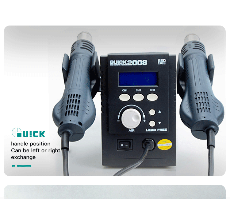 Feature 1: Sensors, closed circuit, the zero passage trigger temperature control of the microcomputer, LED display, big power, heating is rapid, accurate and stable temperature, not affected by the air volume, truly lead-free desoldering.