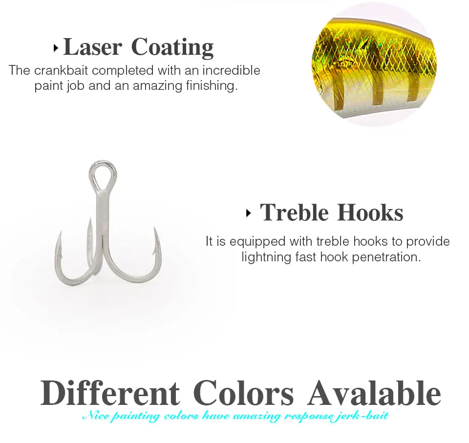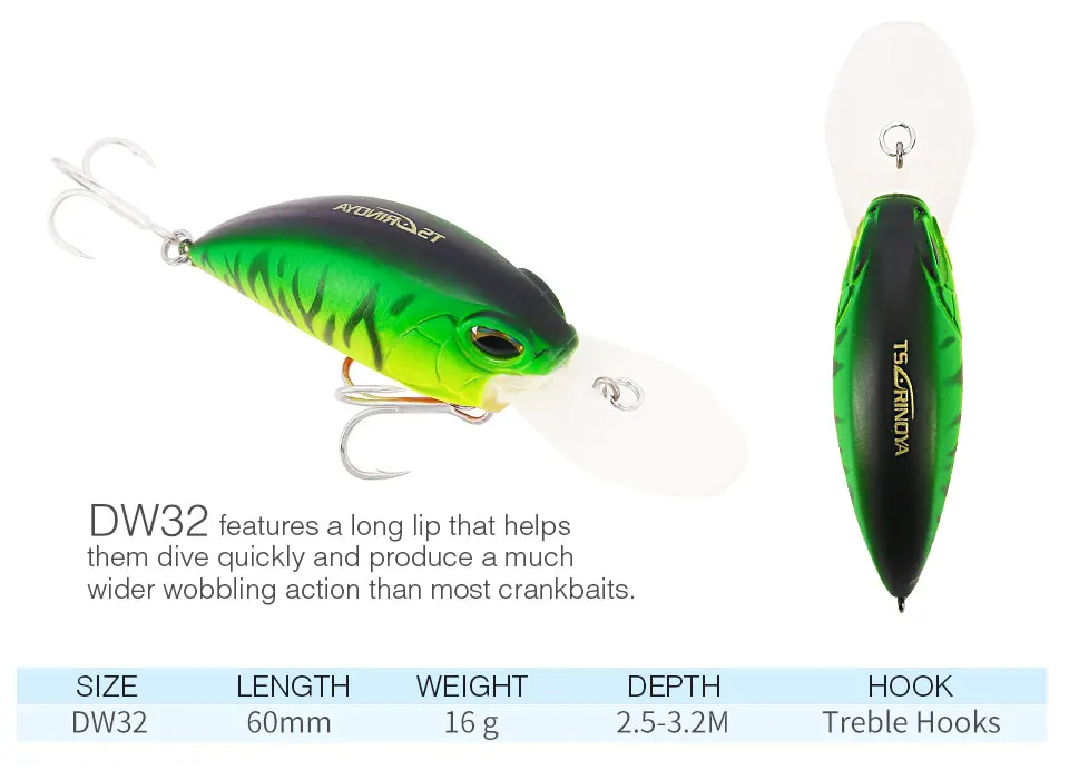 Особенности: 1.DW32 имеет длинную губу, которая помогает им быстро нырнуть и производить гораздо более широкое колебание, чем большинство кренкбейтов 2. Они также спроектированы, чтобы поддерживать истинную глубину бега и поддерживать их действие для большинства извлечения. 3. Добавленный вес производит расстояние забрасывания челюсти, в то же время уменьшая «кулак», который иногда происходит. 4. Губа позволяет быстро отскочить от толстой кисти, деревьев, скал или любого другого типа покрытия, сохраняя положение и траекторию. 5. Большой вес металлических шариков внутри него approvelong расстояние литья, стальные шарики collide друг с другом и издавать звук, который может affract больше рыбы. 6. Построенный с гидродинамическим профилем, приманка имеет форму спортивного автомобиля, что уменьшает сопротивление и создает более быстрое спуск. Подробная информация о продукте: 1. Цвета: A,B,C,D,E,F 2. Вес: 16 г 3. Длина: 60 мм 4. Плавучесть: плавающая приманка 5. Глубина погружения: 2,5-3,2 м 6. Упаковка: 1 шт.